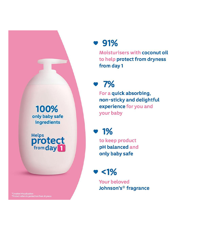 Johnson’s baby lotion, with intensive 24 hour moisture, prevents moisture loss and protects baby’s skin barrier