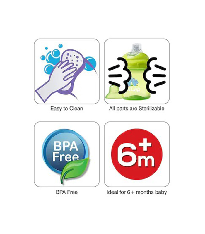 Attractive sippers in various designs and colours. Made from non toxic bpa free plastic and soft silicone. Silicone straw helps in building oral strength. Ergonomically designed, easy to hold and drink from.