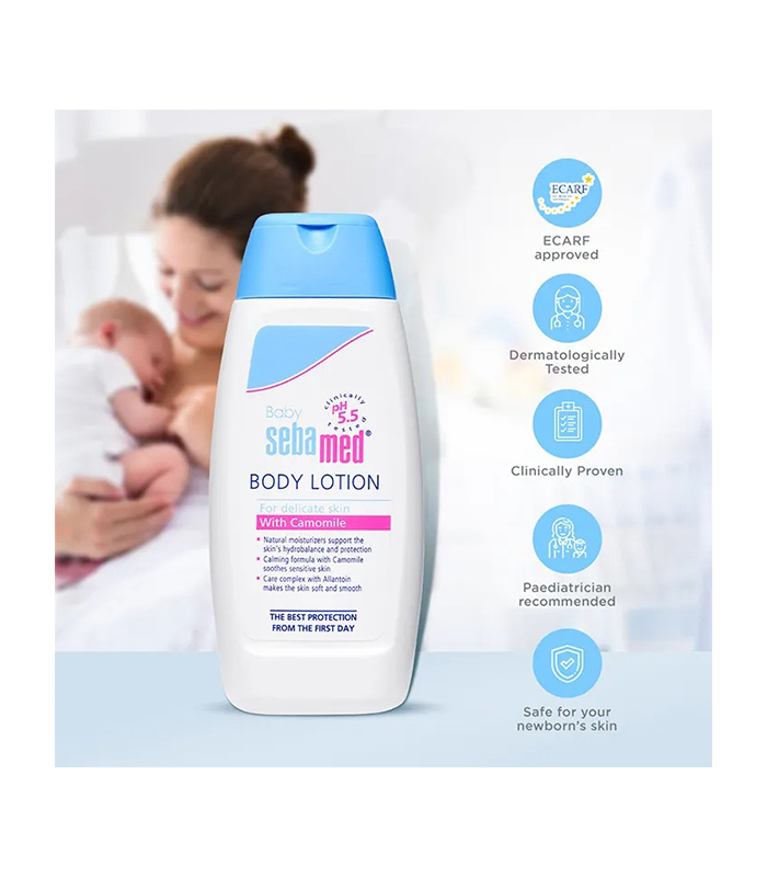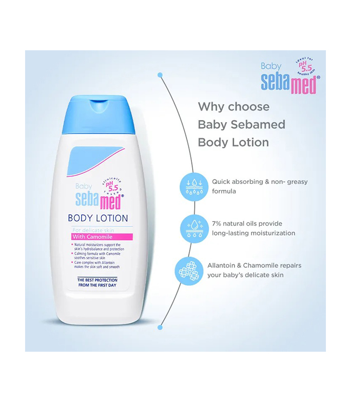 Sebamed Baby Body Lotion is a paediatrician-recommended moisturizing lotion that keeps your baby’s skin moisturized and smooth. It has a pH of 5.5 and is gentle on the baby’s sensitive and delicate skin. It contains natural moisturizers that support the skin’s hydro-balance and protection. It is enriched with a calming formula containing Chamomile that soothes sensitive skin. Its care complex with Allantoin makes the skin soft and smooth, preventing dry, rough, and flaky skin. It is dermatologically tested and safe for newborn skin. It also has a quick-absorbing and non-greasy formula. Regular usage of Sebamed Baby Body Lotion improves the hydration of the baby’s skin.